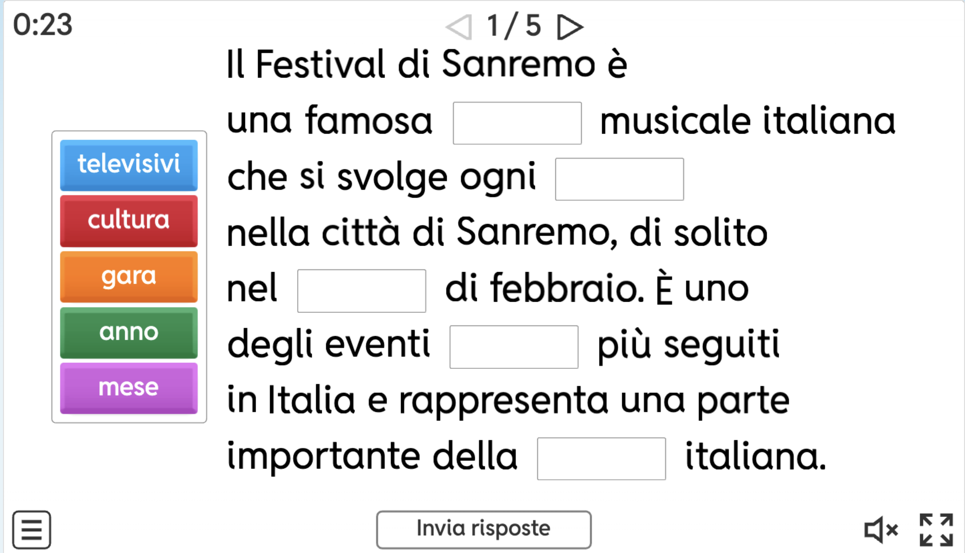Per cominciare, proponiamo un testo bucato, che oltre a stimolare la capacità di fare ipotesi dello studente, attivare conoscenze pregresse, consolidare strutture grammatiche ed ampliare il lessico, ha la funzione di dare alcune informazioni sulle regole e sulle caratteristiche del Festival di Sanremo.